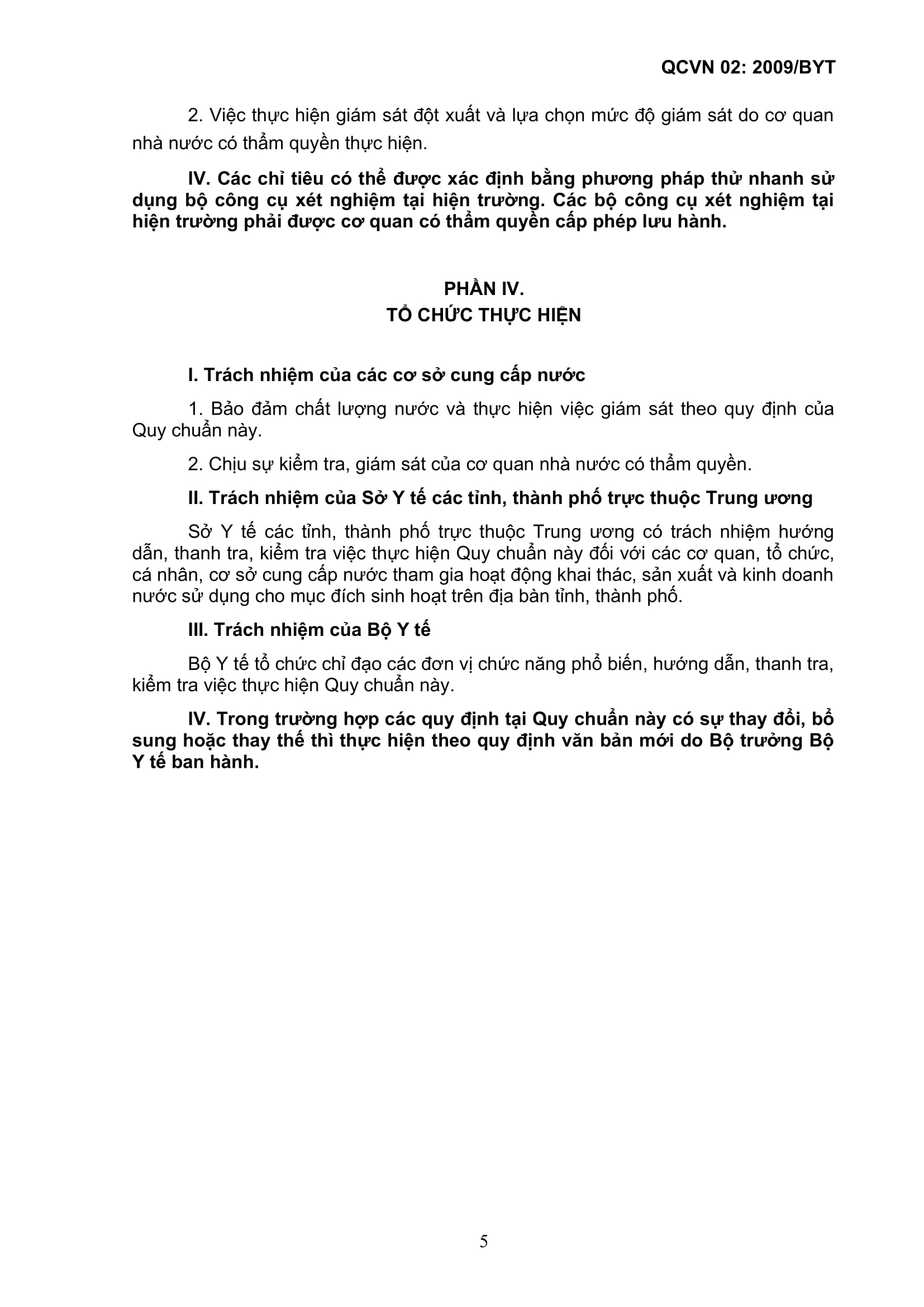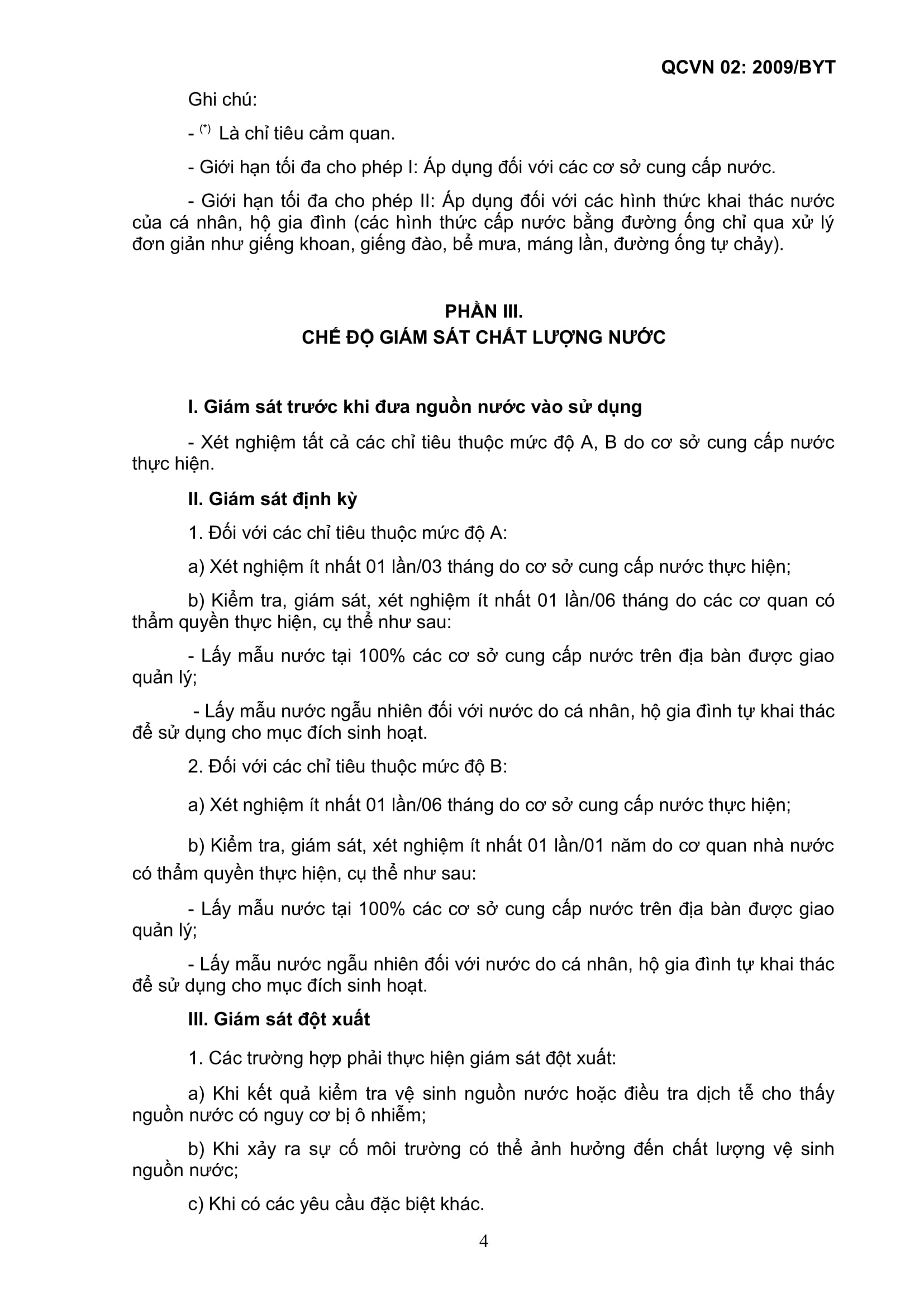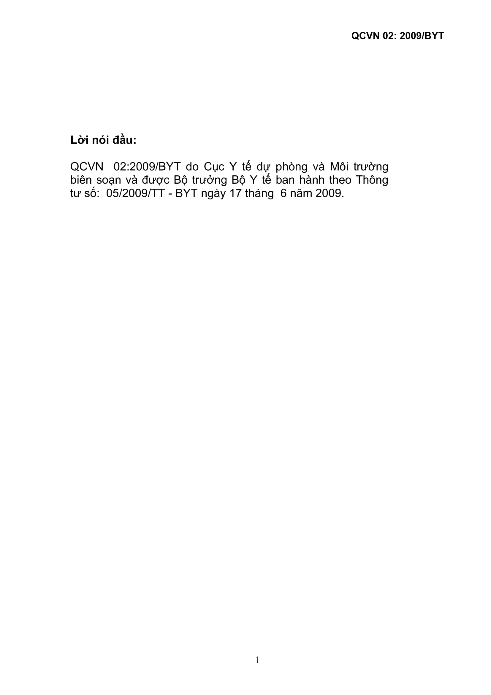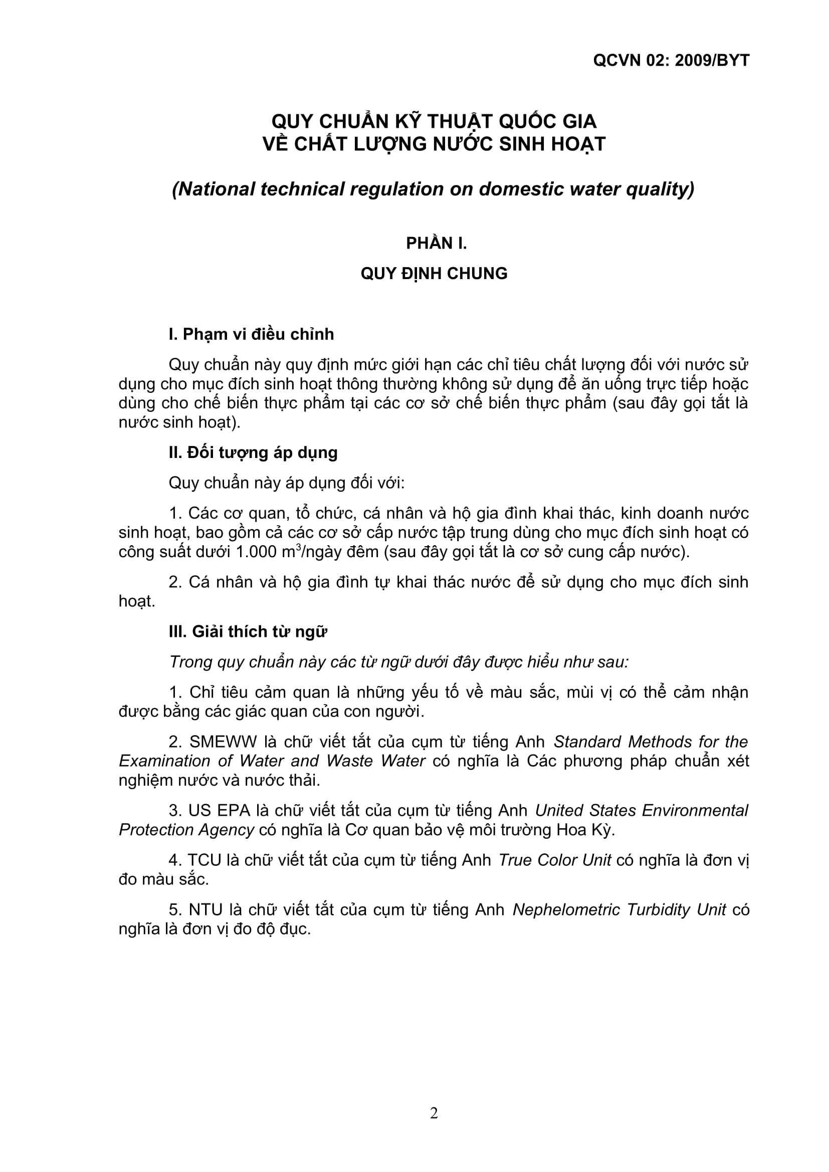 Quy chuẩn kỹ thuật quốc gia về chất lượng nước sinh hoạt QCVN 02:2009/BYT do Cục Y tế dự phòng và Môi trường biên soạn và được Bộ trưởng Bộ Y tế ban hành kèm theo Thông tư số: 05/2009/TT - BYT ngày 17 tháng 6 năm 2009, có hiệu lực từ ngày 1/12/2009.